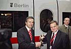 BERLIN - Die DB hat heute ein neues Kapitel in der Geschichte der Zugnamen aufgeschlagen. Der Regierende Bürgermeister von Berlin, Klaus Wowereit, und Bahnchef Hartmut Mehdorn tauften auf dem Berliner Ostbahnhof den ersten ICE auf den Namen einer Stadt. Den Namen "Berlin" erhielt ein ICE T, also ein ICE mit Neigetechnik. Dieser moderne, 230 km/h schnelle Zug fährt unter anderem auf der Strecke Hamburg-Berlin-Leipzig-Nürnberg-München. Der Regierende Bürgermeister nahm den feierlichen Taufakt mit einer Flasche Sekt vor, die er vorsichtshalber nicht am Fahrzeug zerschellen ließ, sondern über dem Endwagen ausgoss. "Ich freue mich, dass Berlin die erste Taufpatin ist. Diese Stadt ist auf dem besten Weg, an die große Geschichte als europäische Bahnmetropole anzuknüpfen. Der ICE 'Berlin' ist hierfür ein guter Botschafter", so Klaus Wowereit. Bahnchef Hartmut Mehdorn ergänzte: "Unsere 216 ICE-Züge bieten schnelle und komfortable Verbindungen. Sie prägen das Bild Deutschlands im In- und Ausland mit. Die gesamte ICE-Flotte wird deshalb nach und nach auf die Namen deutscher Städte getauft, und selbstverständlich macht Berlin als Hauptstadt dabei den Anfang."